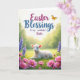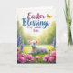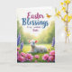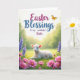 This greeting card features a gentle spring scene with a young, woolly white lamb resting in fresh green grass, its calm gaze and slightly turned head giving the moment a tender, close-to-the-heart feel 🐰. Across the top, the message “Easter Blessings to my wonderful Sister” is set in flowing lettering, with the first words in bright magenta and the remaining lines in deep blue. A small golden butterfly hovers near the top right corner, adding a light, affectionate accent. In the foreground, pink blossoms with warm yellow centres and tall lavender flower spikes rise around the lamb, like a soft floral frame. The lamb’s ears show faint pink at the tips, a sweet detail that pairs nicely with the nearby petals 🌷. Behind it all, a sunlit background fades into golden, out-of-focus circles over leafy greens, suggesting a quiet morning shared with someone dear. The flowers cluster most densely along the lower edge, while the butterfly sits alone against the bright upper right sky.