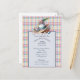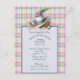 A colourful feathered East bonnet surrounded by eggs decorates the top of this invitation.