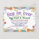 Hop on over for an Easter brunch and egg hunt! Invite your guests to your party with this charming super adorable invitation featuring a joyful white bunny hops through a sun-drenched meadow bursting with wildflowers — daisies, tulips, bluebells, and dandelions — while carrying a woven basket filled with colorful, patterned Easter eggs.