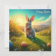 A cute Easter bunny sits in the middle of a blooming spring meadow, surrounded by colourful Easter eggs and bright flowers. The warm sun bathes the scene in a golden light, while gentle hills in the background create an idyllic atmosphere. A picture full of spring magic and Easter joy!