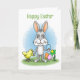 The Easter bunny and the chicken present the colorful Easter eggs.