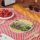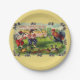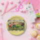 Cute Easter scene of barnyard animals playing baseball on paper plates. Decorate your Easter table with these funny paper plates showing a bunny, a rooster, and little chicks playing baseball on Easter Day.