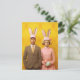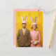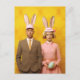 Whimsical retro man and woman with serious face expression, wearing bunny ears on their head and she is holding pastel coloured easter eggs