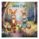 Mother Rabbit: On the right, a slightly smaller rabbit wearing a light blue dress with a darker blue sash around the waist and a small red bow tie. She also carries a basket of Easter eggs. She has a delicate floral crown on her head.