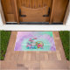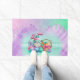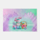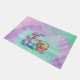 Easter Bunny Gnome with pink bunny ears sitting in spring flowers with decorated eggs and a wicker basket of carrots set on a watercolor teal and purple plaid background with pastel candy icing drips.