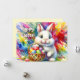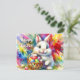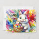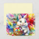 Funny customisable Easter Card - Easter Bunny holding Colourful Eggs in Basket - This cute colourful, generative content ai Design shows a cute white Easter bunny holding a basket full of colourful Easter eggs, on the background are vivid colourful watercolor splashes in red, pink, yellow, green, blue.
