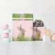 Bunny rabbit in green grass with pink Easter eggs on blush pink background.