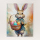 Jigsaw puzzle of a cheerful rabbit in a blue outfit carrying a basket filled with colourful, decorated eggs. The background features soft floral details and gentle, warm colours.