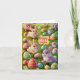 Cute Pink and white bunny rabbit hopping around easter eggs. Happy easter greetings in red colour on a yellow background. A cute bunny pattern at the back of the card.