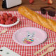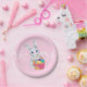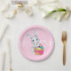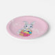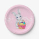 This paper plate is shown in a festive Easter Bunny with eggs print in a pink colour.