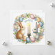 The image depicts a beautifully designed Easter-themed illustration. It features two bunnies sitting opposite each other, with a lit candle in the centre. The bunnies are surrounded by a circular arrangement of pastel-coloured Easter eggs, flowers, and green foliage. Above the candle, the text "Happy Easter" is written in a curved style.