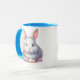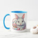An adorable white Easter bunny is ready with a basket of Easter pastel eggs and spring flowers is ready for hiding on Easter morning. This pretty mug is ready for your Easter morning coffee or tea!