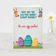 This greeting card features a light gray background with a faint speckled shimmer and a springtime joke set front and center. Across the top, a teal question in rounded lettering asks, “WHY DID THE EASTER BUNNY LEAVE SCHOOL?” and it’s framed by two cute, wide-eyed children who lean slightly inward like close friends sharing a secret 🐰. One child wears a sunny yellow hood with long animal ears, and the other wears an aqua hood with matching ears, both smiling warmly while holding small woven baskets. Beneath the question, the punchline “He was egg-spelled,” appears in bright magenta, written in a flowing cursive style that curves gently across the middle. The lower half turns into a rolling green field sprinkled with tulips in several colors, adding a soft garden feel 🌷. Three large decorated eggs sit prominently in the grass—one purple, one teal, and one golden yellow—each outlined clearly against the green. White decorative details cover the eggs, including wavy swirls, dotted patterns, and tiny star-like flowers.