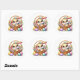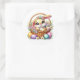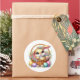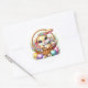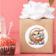 Round sticker is shown with a cute Easter bunny in a basket of flowers art print.