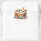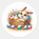 Round sticker is shown with a cute Easter bunny art print.