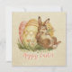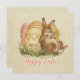 This sweet card features a beautiful watercolor painted bunny rabbit sitting up against pretty coloured Easter eggs. Typography on the front says Happy Easter below him in a dark peachy pink with a white edge. The bunny is set against a faux linen pale yellow background. On the reverse side of the card is a place for you to personalise with your own Easter greeting and your name.