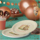 These sweet Easter Bunny paper plates featurea beautiful watercolor painted bunny rabbit sitting up against pretty coloured Easter eggs. Typography on the front says Happy Easter below him in a dark peachy pink with a white edge. The bunny is set against a faux linen pale yellow background.