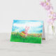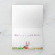 This joyful Easter card features a bright watercolour image of a pink Easter bunny in the middle of a spring flower garden. The bunny is hiding behind a giant yellow Easter egg decorated with colourful spots and squiggles. The inside of the card reads, "Wishing you a joyful Easter!". This card would work well for anyone who loves gardening, bunnies, and cheerful Easter eggs.