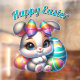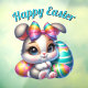 An adorable cartoon Easter bunny in pastel colours with a rainbow bow and vibrant decorated eggs.