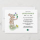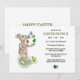 The Easter Bunny juggles the Easter eggs while the little chicken is the audience.