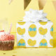 Cute yellow pattern of Easter eggs tied with a blue bow and baby chickens.