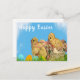 Vintage Easter chicks background with blue sky, grass, and cute Easter eggs.