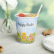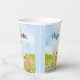 Bright spring colors and playful charm decorate these watercolor Easter paper cups, featuring a fluffy baby chick carrying a basket of colorful Easter eggs while a friendly bunny in a pink bowtie keeps watch nearby. Surrounded by blooming pastel tulips, the cheerful design captures the joyful spirit of the season, adding a festive and whimsical touch to Easter brunches, egg hunts, and spring celebrations.