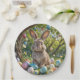 A cute bunny sits surrounded by colourful, decorated eggs under a tree with hanging eggs