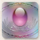 A pastel blue, lavender, and pink design with a translucent pink egg in a silver filigree setting, circled by a light silver oval frame set with four more smooth gems like colourful eggs.