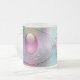 A pastel blue, lavender, and pink design with a translucent pink egg in a silver filigree setting, circled by a light silver oval frame set with four more smooth gems like colourful eggs.