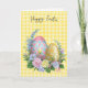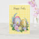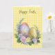 Cute watercolor decorated Easter eggs with a pink ribbon on a yellow and white gingham pattern.