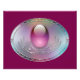 A pastel blue, lavender, and pink design with a translucent pink egg in a silver filigree setting, circled by a light silver oval frame set with four more smooth gems like colourful eggs.