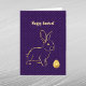 Elegant gold bunny outline with gold egg on a purple & gold background.