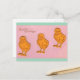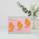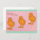 A vintage / antique Happy Easter postcard with three fuzzy yellow felt chicks all in a row. Background in pink. Happy Easter!