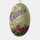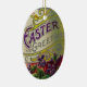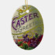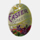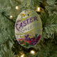 A large, ornate, Victorian Easter egg standing up-right in a patch of Violets.