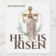 Perfect for a Catholic Church; an easter celebration or your home, this beautiful design featuring Jesus Christ, the son of God, framed by a geometric frame adorned with eucalyptus leaves, has his hands lifted up to praise the Lord. He is standing in front of the wooden cross he was nailed to and the crown of thorns is dangling on the top of the post. Templates in dark brown appear to his left in a bold font which read, he is risen, Matthew 28.6.