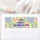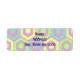 These return address labels have a geometric design of hexagons in pale blue, pale yellow, and pale green on a field of stripes in pale pink and pale purple.