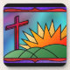 A stained-glass design illustrating Easter morning, with a red cross standing on green hills beside a fiery sunrise.