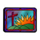 A stained-glass design illustrating Easter morning, with a red cross standing on green hills beside a fiery sunrise.
