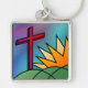 A stained-glass design illustrating Easter morning, with a red cross standing on green hills beside a fiery sunrise.