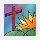 A stained-glass design illustrating Easter morning, with a red cross standing on green hills beside a fiery sunrise.