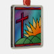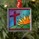A stained-glass design illustrating Easter morning, with a red cross standing on green hills beside a fiery sunrise.