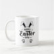 The design includes the text "Happy Easter Day" in a decorative font. Above the text, there are illustrations of bunny ears, and below the text, there are images of bunny paw prints. The mug is placed on a light-coloured, possibly marble, surface. The overall theme is festive and related to Easter.