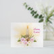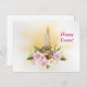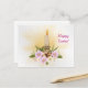 Easter Christian Holiday Card. Pink flowers with a candle and hot cross buns.