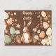 Wish all your loved ones a Happy Easter with our chocolatey spring greeting card! This greeting card features an Easter bunny with eggs and flowers in pastel colours. The chocolate coloured background should make an impression on those who receive this greeting card!