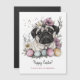 Cute pug Easter botanicals postcard. Rustic watercolors and lineart style pastel colour pug with Easter eggs and floral botanicals. Personalised text with a lovely trendy script.