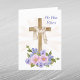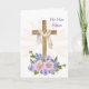 Easter Christian Holiday Card. Empty cross "He Has Risen" with flowers.