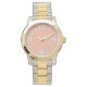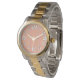 This women's watch has an Easter design of split circles on lines in green, blue, and purple on a field of orange.