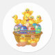 This large size round sticker is shown in white with a cute Easter chicks and a basket of eggs print.