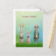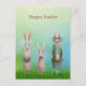 Wish Happy Easter to friends and family with this adorable image of three bunnies, two of which are holding Easter eggs. Each bunny has a different expression on their face and cute eyes. The rabbits are standing on tall green grass with a pale green and blue background. The text says "Happy Easter".